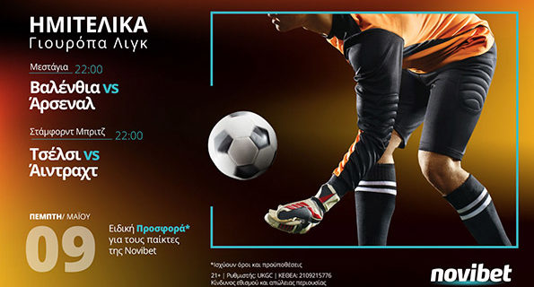 Ολοκληρώνεται απόψε η ημιτελική φάση του Europa League με τους επαναληπτικούς Βαλένθια – Άρσεναλ και Τσέλσι – Άιντραχτ, μέσα από την πλατφόρμα της Novibet. Το ζευγάρι που θα συνθέσει τον τελικό του Αζερμπαϊτζάν (Μπακού, 29/5) θα γίνει γνωστό το βράδυ της Πέμπτης.