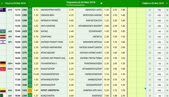 Ιδιαίτερα πλούσιο το πρόγραμμα στο σημερινό κουπόνι πάμε στοίχημα (04/05), όπου οι επιλογές είναι αρκετές. Γεμάτο πρόγραμμα σε Β’ Γαλλίας, δράση έχουμε επίσης σε Αγγλία, Ισπανία, Γαλλία και Τουρκία.