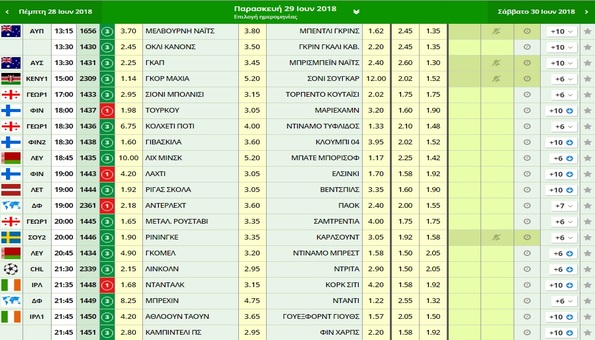 Ολοκληρώθηκε η φάση των ομίλων του Μουντιάλ, σήμερα έχουμε την πρώτη μέρα χωρίς δράση. Οι νοκ-άουτ αγώνες ξεκινούν αύριο με τις αναμετρήσεις Γαλλία – Αργεντινή και Ουρουγουάη – Πορτογαλία. Στο κουπόνι πάμε στοίχημα (29/06) ξεχωρίζει η αναμέτρηση Λίνκολν – Ντρίτα για τα προκριματικά του Τσάμπιονς Λιγκ, ενώ δράση υπάρχει επίσης σε Ιρλανδία, Αμερική, Φινλανδία και Β’ Βραζιλίας.