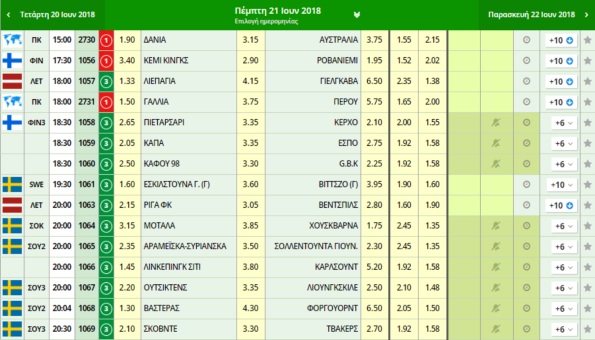Για την όγδοη ημέρα του Παγκοσμίου Κυπέλλου, διεξάγονται σήμερα τρία παιχνίδια στα πλαίσια της δεύτερης αγωνιστικής. Στις 15:00, η Δανία υποδέχεται την Αυστραλία, θέλοντας να κάνει το 2×2 στον όμιλο, ενώ στις 18:00, η Γαλλία παίζει κόντρα στο Περού, ευελπιστώντας σε μια καλύτερη εμφάνιση από αυτή που είχε στην πρεμιέρα. Η ημέρα κλείνει με το παιχνίδι Αργεντινή – Κροατία. Το κουπόνι πάμε στοίχημα (21/06) περιλαμβάνει επίσης αναμετρήσεις σε Φινλανδία, Λετονιά, Χιλή και Βραζιλία.