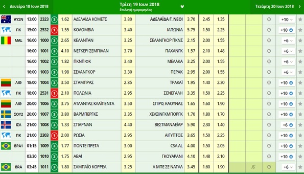 Έκτη ημέρα Μουντιάλ απόψε, με το πρόγραμμα να περιλαμβάνει την πρεμιέρα του τελευταίου ομίλου και την έναρξη του δεύτερου γύρου για τον πρώτο όμιλο. Στις 15:00 η Κολομβία αναμετράται με την Ιαπωνία, λίγο αργότερα η Πολωνία έχει το προβάδισμα κόντρα στη Σενεγάλη, ενώ στις 21:00 η Ρωσία αντιμετωπίζει την Αίγυπτο. Το κουπόνι πάμε στοίχημα (18/06) περιλαμβάνει επίσης αναμετρήσεις σε Σουηδία, Ισλανδία και Βραζιλία.