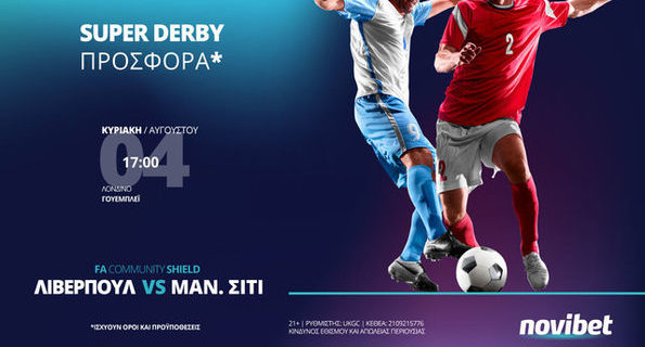 Με σούπερ ντέρμπι ξεκινά η σεζόν στην Αγγλία και στη Novibet. Λίβερπουλ και Μάντσεστερ Σίτι διασταυρώνουν τα ξίφη τους στο Γουέμπλεϊ του Λονδίνου στο πλαίσιο του τελικού του Community Shield, του αντίστοιχου Σούπερ Καπ της Αγγλίας. Η σέντρα του μεγάλου αυτού αγώνα είναι προγραμματισμένη για τις 17:00, ώρα Ελλάδος.