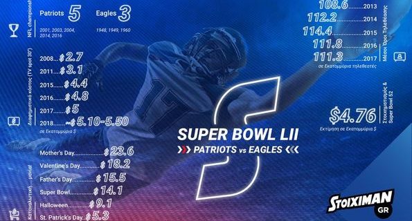 H κόντρα του μυθικού πλέον Tom Brady και του Quarterback των Eagles, Nick Foles αναμένεται να καθηλώσει περισσότερα από $150 (!) εκατομμύρια τηλεθεατές σε ολόκληρο τον κόσμο, με τους Patriots να στοχεύουν στο 6ο τους Super Bowl σε αντίθεση με τους Eagles που έχουν στην κατοχή τους 3 ΝFL τίτλους, αλλά κανέναν στην εποχή του Super Bowl!